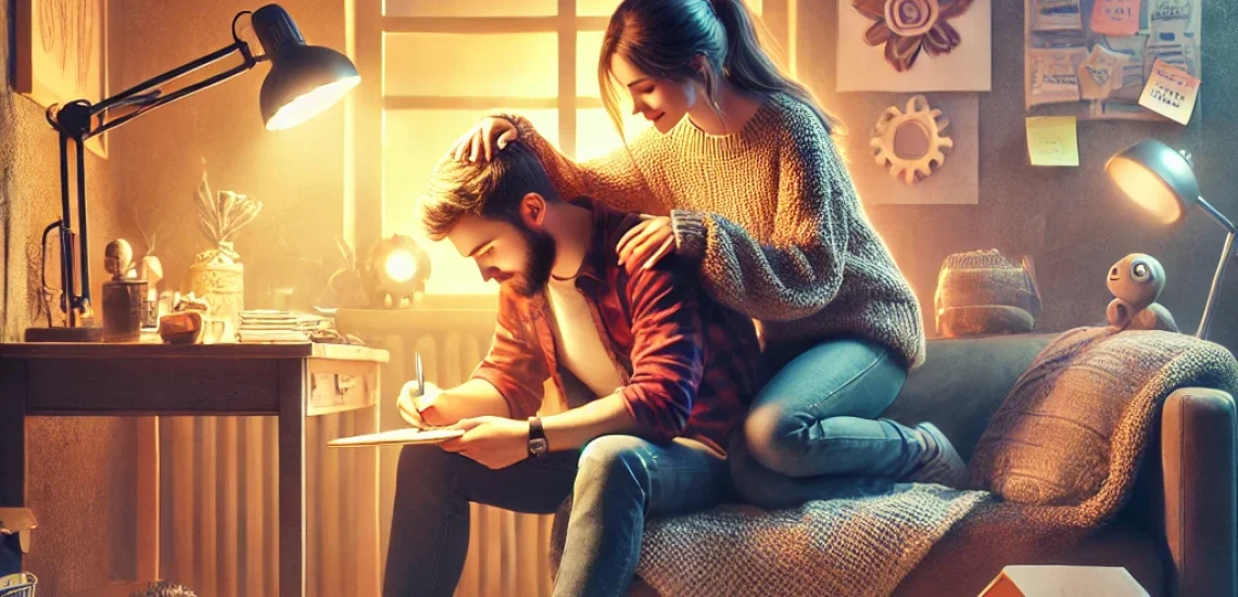 44Tage - A visually engaging and realistic image illustrating the challenges and joys of living with a partner with ADHD. The scene shows a couple in a cozy li